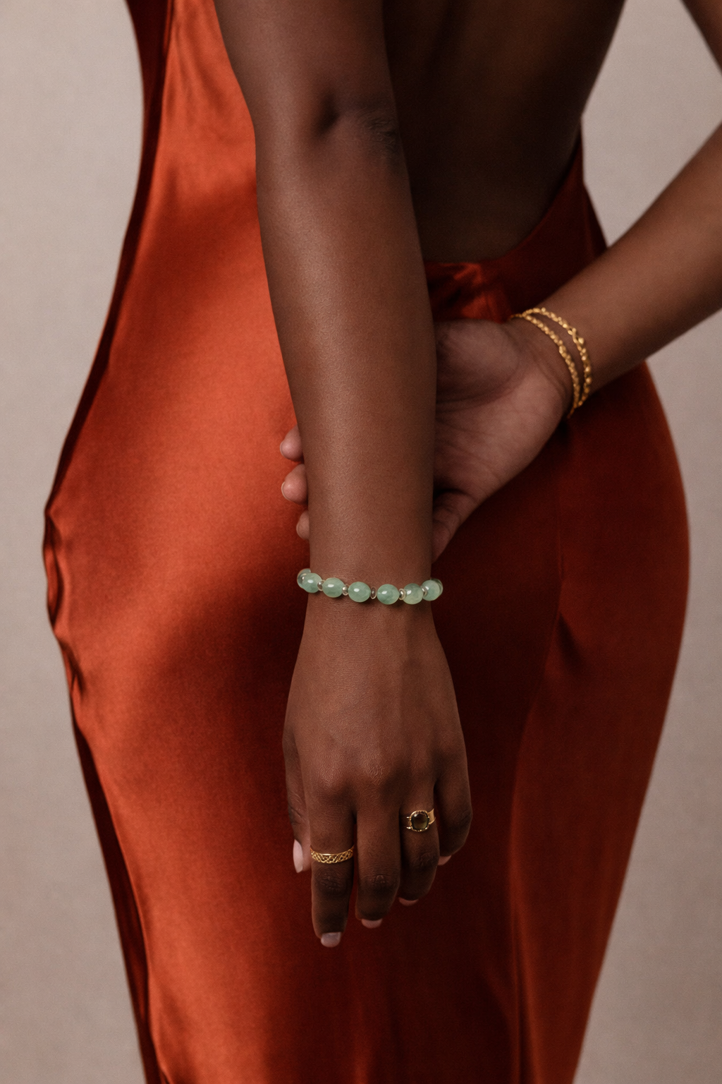 Welcome the gentle, abundant flow of luck and new growth with MNOTHO. This Green Aventurine bracelet carries the fertile frequency of spring rain- attracting opportunity, dissolving old blocks to prosperity, and nurturing the heart's courageous new beginnings. For moments of fresh starts, financial intention, or when you need a boost of optimistic energy, MNOTHO is your magnet for luck, your soothe for an anxious heart, and the steady, growing promise that good things are on their way to you. MNOTHO is the crystal of heart-centered abundance and emotional well-being. Its primary action is attracting opportunity and luck; its secondary quality is healing the emotional wounds that block the flow of prosperity.